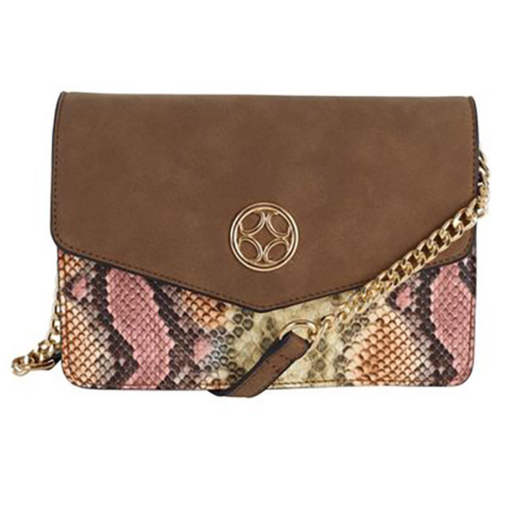 En bra bag som kan bäras i handtag eller som axelväska. Snakemönster på framsidan och svart på baksidan.